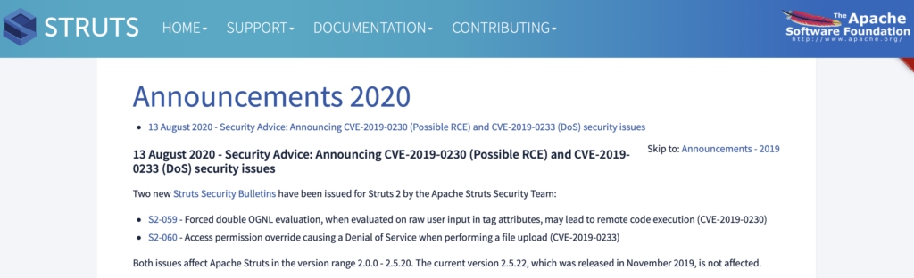 通告链接://struts.apache.org/announce.html#a20200813