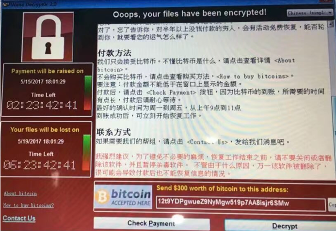 感染台数较多,大量重要信息被加密,只有支付高额的比特币赎金才能解密恢复文件,损失严重。远程利用代码和4月14日黑客组织Shadow Brokers(影子经纪人)公布的Equation Group(方程式组织)使用黑客工具包有关。其中的ETERNALBLUE模块是SMB漏洞利用程序,可以攻击开放了445端口的Windows机器,实现远程命令执行。微软在今年3月份发布的MS17-010补丁,修复了ETERNALBLUE所利用的SMB漏洞。目前基于ETERNALBLUE的多种攻击代码已经在互联网上广泛流传,除了捆绑勒索病毒,还发现有植入远程控制木马等其他多种远程利用方式。