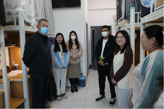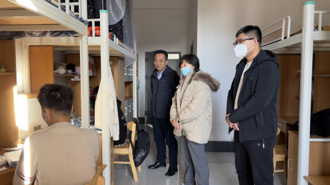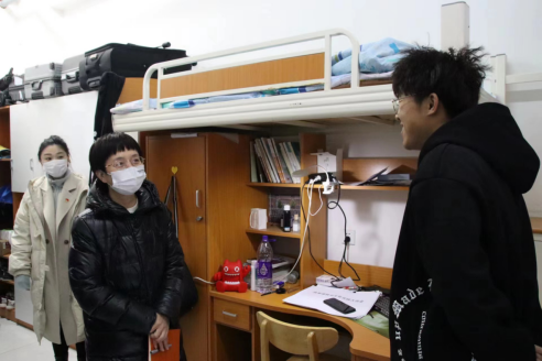 在学生宿舍,郭玉铸查看了学生上网课的具体情况,并与同学们亲切交谈。“寝室暖不暖和?”“对校园防疫政策是否了解?”“对期末教学的时间节点是否清楚?”“现在的学习生活有没有什么困难?”“考试结束返乡时,也要做好个人防护!”郭玉铸书记的殷切关怀让同学们倍感温暖,宿舍里回荡着阵阵欢笑。
