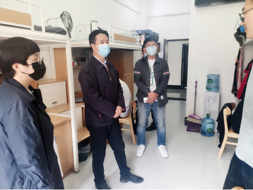 杨斌一行先后走访了9号宿舍楼、14号宿舍楼。在电子与自动化20级男生宿舍、英语20级女生宿舍,院领导与同学们进行了亲切交流,详细了解同学们的宿舍生活、线上学习情况及学习效果,听取同学们的诉求和建议。