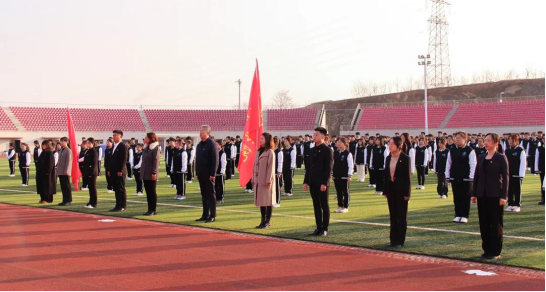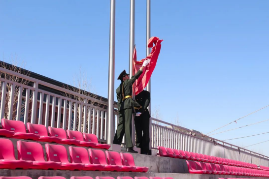 国旗护卫队迎着朝阳,怀着赤诚之心护送国旗入场。随着国歌的奏起,五星红旗缓缓上升,迎风飘扬。全体参会人员向国旗行注目礼。“开学第一课”在庄严有序的升旗仪式中拉开序幕。