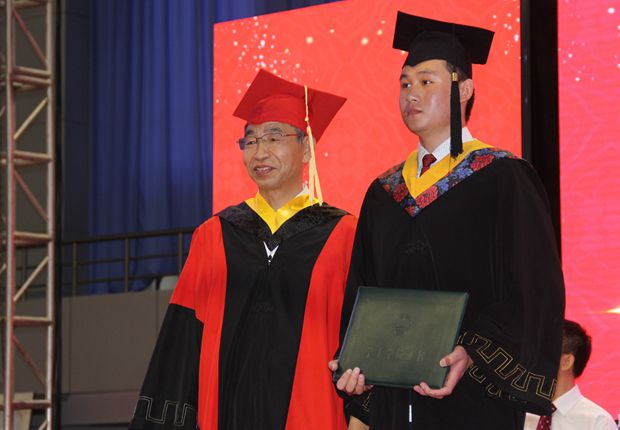 在全场热烈的掌声中,匡国柱院长向荣获学士学位的毕业生代表颁发学位证书。