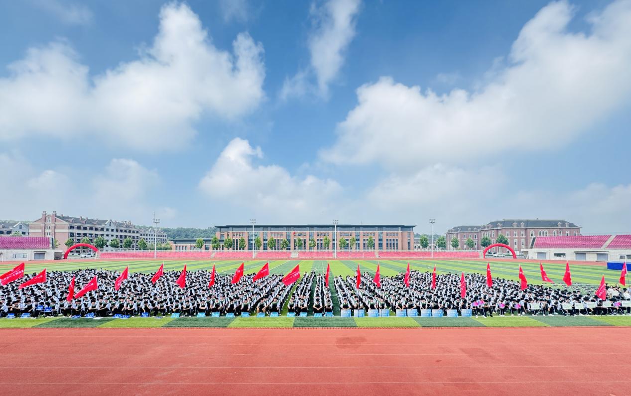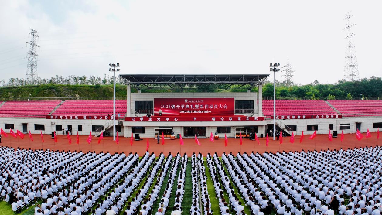 体育场举行。党委书记郭玉铸、院长杨斌、副院长石华、沈海龙、邹亚新、分院领导、各教师代表、在校生代表及2025级全体新生参加大会。