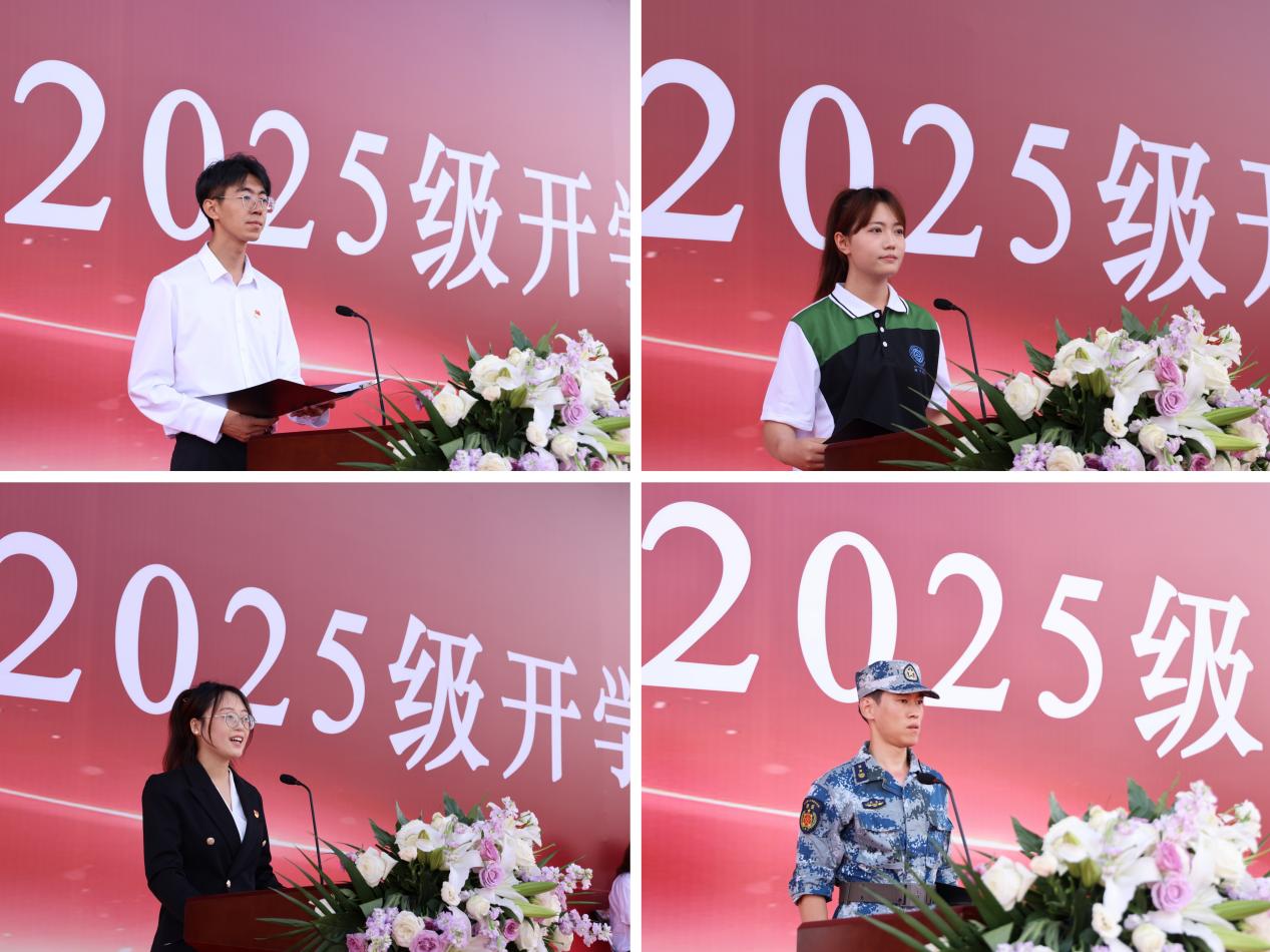 王嘉怡同学代表在校生发言,呼吁新生“长志气、强骨气、厚底气”,为中国式现代化建设贡献力量;虚拟现实技术刘博同学代表军训教官团发言,回顾自身军旅经历,他鼓励学生坚持挑战,用汗水磨炼意志、用团结凝聚力量,为大学生活开启精彩篇章。