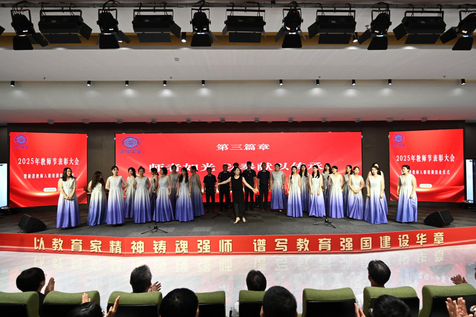 大会在庄严的国歌声中拉开帷幕,随后进行2025年新进教师入职培训结业仪式。