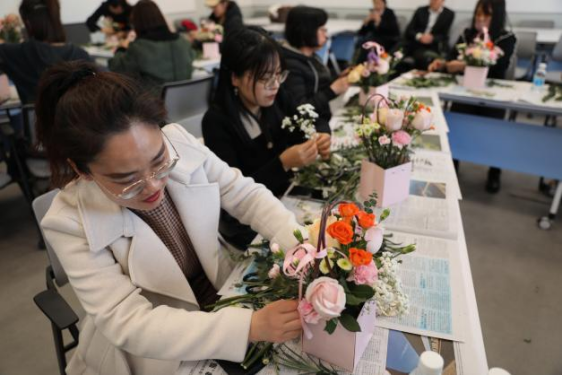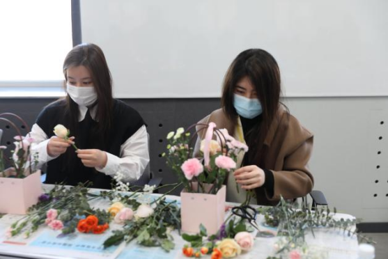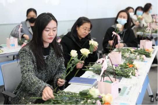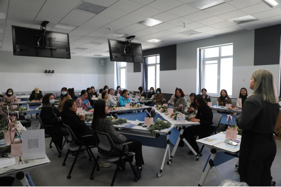 参加活动的教师们聚精会神、兴趣盎然。通过结合花朵大小、颜色搭配、高低相间及主次衬托,教师们设计并创造出一件件专属的各具特色的花艺作品。