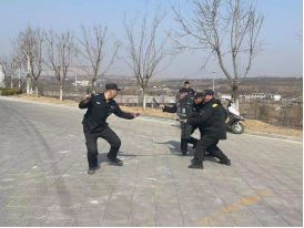 反恐防爆培训由周立彬警官主训,重点培训了反恐防爆器械“八大件”的使用方法以及反恐防爆“棍盾叉”组合站位的操作方法。