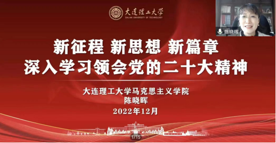 陈晓晖教授以《新征程新思想新篇章——深入学习领会党的二十大精神》为主题,从党的二十大的大会主题、主要成果、召开进程、报告诞生、报告内容、报告关键词六个方面,解读和阐释了党的二十大提出的新思想新论断;从“中国共产党跳出历史周期率两个答案之间的辩证关系”、“中国共产党坚持自我革命的历史进程”、“新时代中国共产党坚持自我革命的理论逻辑、历史逻辑、现实逻辑”、“新时代中国共产党坚持自我革命的实践遵循”四个方面深入阐释了党的自我革命的内涵本质。她强调,自我革命是党经过不懈努力找到的破解历史周期率的第二个答案,自我革命是中国共产党作为马克思主义政党的本质要求,是中国共产党不断从胜利走向胜利的根本保证,是中国共产党永葆先进性和纯洁性的必然要求。我们必须坚持党的全面领导、推进党的政治建设、强化理想信念、坚定站稳人民立场、始终抓好关键少数、完善制度规范体系。
