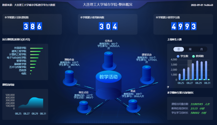 -分院两级线上课堂监督,抽查听取教师课堂讲授情况,实时了解教师授课情况和学生学习情况、签到情况,对网课进行全过程跟踪,严抓线上课堂教学质量,全面提高线上教学水平和教学质量。截至目前,线上教师人数266人,教师累计组织教学活动252763次;线上学生人数4331人,学生累计参加线上教学活动10169878次,全院平均到课率达到92%。