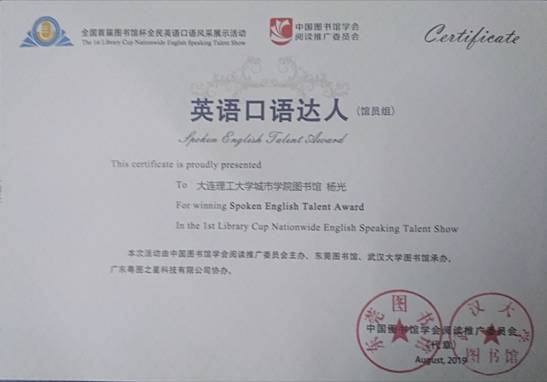 本网讯 日前,在『全国首届“图书馆杯”全民英语口语风采展示活动』中,伟德 图书馆馆员杨光脱颖而出,荣获“全国首届‘图书馆杯’全民英语口语大赛”馆员组“英语口语达人”奖。该活动是一项面向全国各类图书馆读者开展的将图书馆宣传与英语口语竞技相结合的风采展示活动,由中国图书馆学会阅读推广委员会主办。