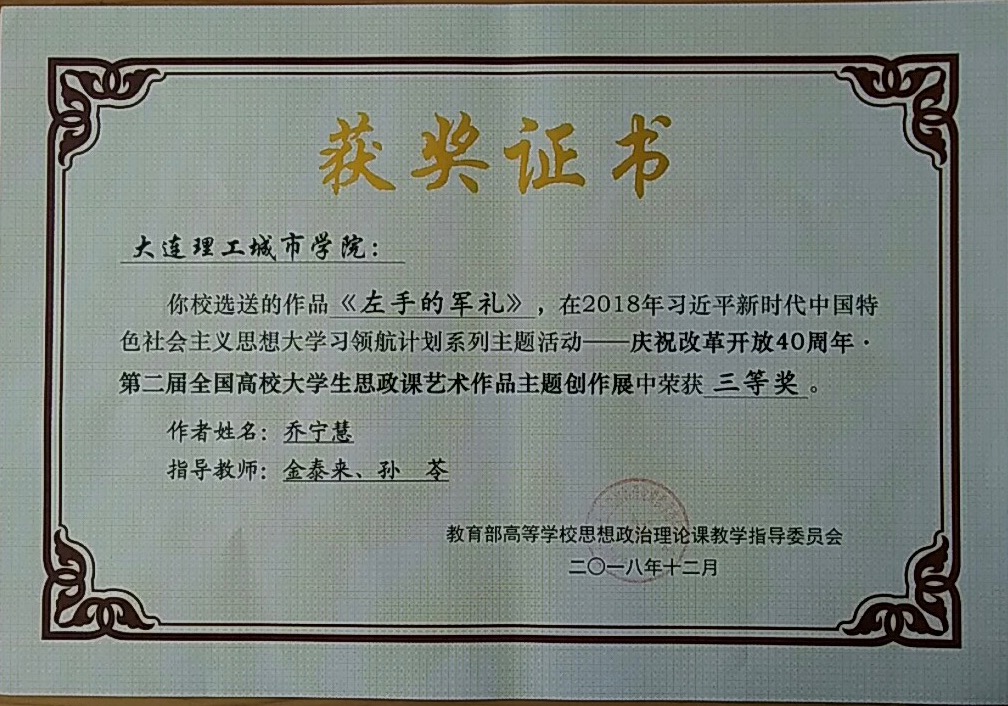 选送的绘画作品《左手的军礼》被评为三等奖。