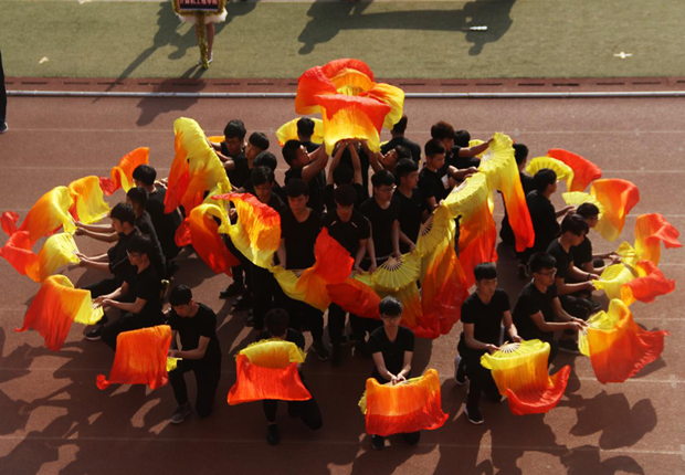 大型团体啦啦操《炫舞青春》的表演,六个分院的同学们齐心合力,用闪耀的花球和动感的节拍点燃运动会的激情。