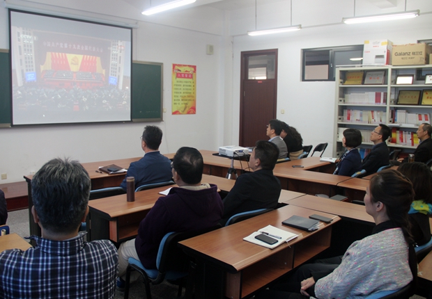 班子成员、党委委员、各部门、各分院负责人、各党支部书记到2705教室集中收看党的十九大开幕会实况,聆听习近平总书记代表十八届中央委员会向大会作的报告,庆祝党的十九大胜利召开。广大师生员工也通过电视、网络、广播等不同形式收看、收听了十九大开幕式实况,师生们高度关注,反响热烈。