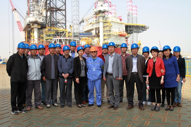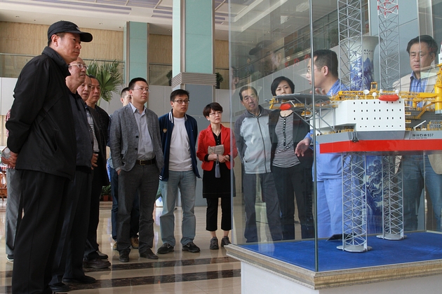 当日下午,考察团一行首先来到公司办公区大厅,在公司负责人的细心讲解下,参观了BINGO 9000型半潜式平台、JU2000E型、CJ46型自升式钻井平台、F&G 9500型半潜式钻井平台的等比例缩小模型,继而在会议室观看了介绍公司产品的相关视频。同志们纷纷就自己感兴趣的问题进行提问,公司负责人也耐心细致地一一作答。当日下午,考察团一行还实地参观了船坞、船台等生产线,近距离感受了钻井平台的宏大与壮观。