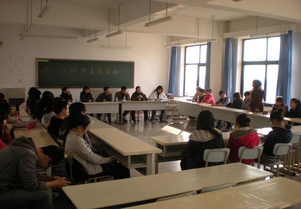 在1512教室召开日语专业师生座谈会。分院院长熊英、副院长赵立红、学生工作办公室主任赵宁以及日语专业教研室蒋斌老师、陈钟善老师与日语2008级、2009级和2010级的学生代表进行了座谈。