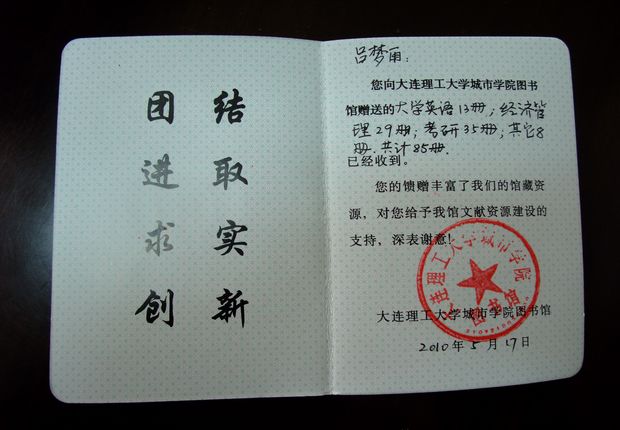 图书馆向吕梦雨同学颁发了捐赠证书