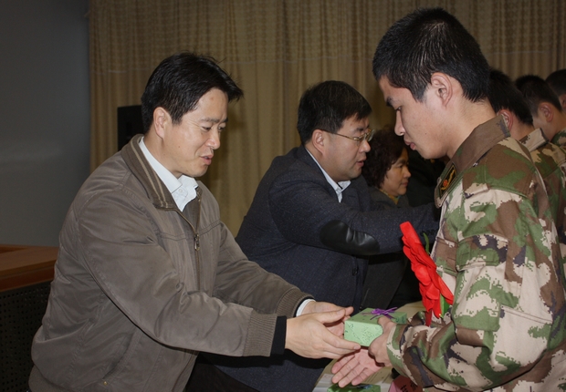 领导为参军入伍的同学佩戴红花并赠送纪念品。