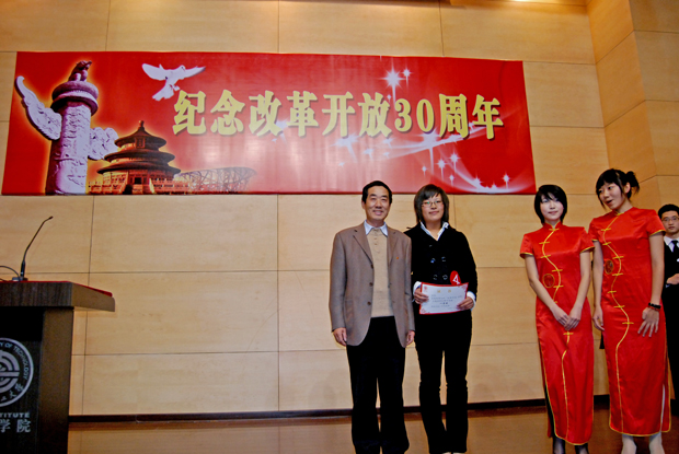 的温思以9.49分夺得一等奖;信息管理系索引、自动化系赵文、工程管理系吴辰昊分别获得二等奖;物流管理系韦秋实、计算机系刘旭分别获得三等奖;王艺云、牛彦博、穆文婧、王梅、张震获得优秀奖。李宪起助理为一等奖获得者颁发了奖品。