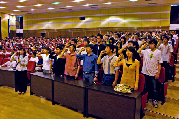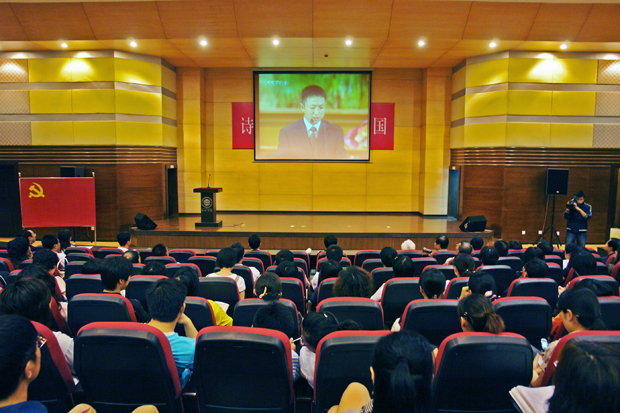 观看抗震救灾英模事迹报告会前,全院120名预备党员(教师预备党员6人,学生预备党员114人)面对党旗,庄重宣誓。郭玉铸书记、王铁成副院长、院长助理李宪起及党外人士院长助理马建军、管理伟德