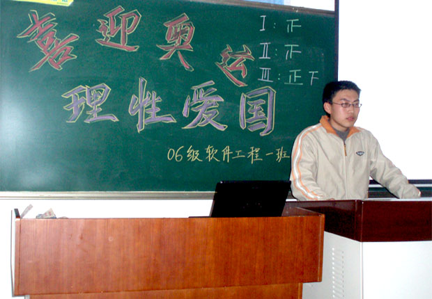 4月25日中午,06级软件工程1班在教学楼1201教室召开“欢度院庆,喜迎奥运,理性爱国,努力学习”主题班会。