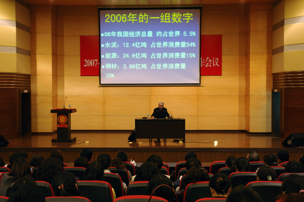报告会上,罗均炎老师通过自己对两会精神的深入学习和理解,结合大量翔实的资料,以“过去五年我国经济跨上新台阶”、“2007年,我国国民经济克服阻力和困难,实现了又好又快地发展”、“坚持改革扩大对外开放”、“当前物价上涨,通货膨胀压力增大”为主题,对两会精神进行了深入浅出的诠释和阐述。