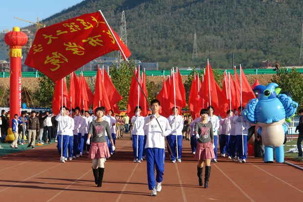 领导和全体师生的检阅。他们或高举一面面火红的旗帜,或挥舞手中五彩缤纷的鲜花,或摆成富有象征意义的奥运五环标志等图案,或手擎一条条标语拼版,精神抖擞、意气风发。教师队伍放飞手中的气球,自信的笑容更是体现了“谁与争锋”的精神风貌。