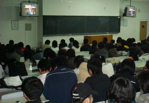 预备党员和入党积极分子约100多人,在实验楼JT101教室集中收看了中央电视台的相关报道。