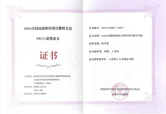 数字媒体技术专业教师宋莉媛的《基于OBE理念的 C++程序设计课程改革与探索》和虚拟现实技术专业教师田欣的《Unity实战驱动的C#程序设计教学革新》凭借创新的研究视角和深入的实践探索在200余篇参评论文中荣获特等奖,并被由教育部主管,清华大学主办的国家级权威期刊《计算机教育》录用。宋莉媛还受邀在大会分论坛中发表演讲,分享她的研究成果和教学经验。数字媒体技术专业教师李玲的《图像的基本运算》在300余组参评案例中脱颖而出,荣获一等奖。