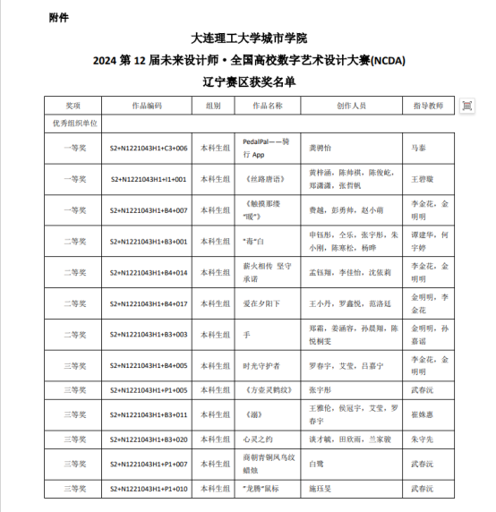 学生作品获国家级奖项4项,其中一等奖1项、二等奖1项、三等奖2项;在辽宁省赛区中还荣获一等奖3项、二等奖6项、三等奖13项的优异成绩。