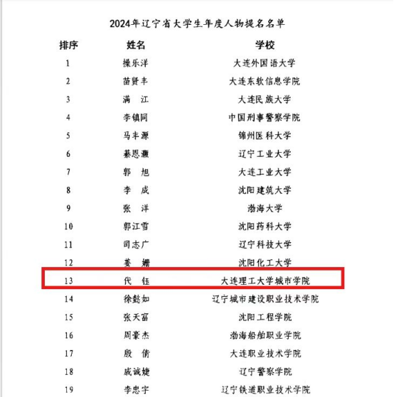 2022级学生代钰荣获2024年“辽宁省大学生年度人物”提名奖。