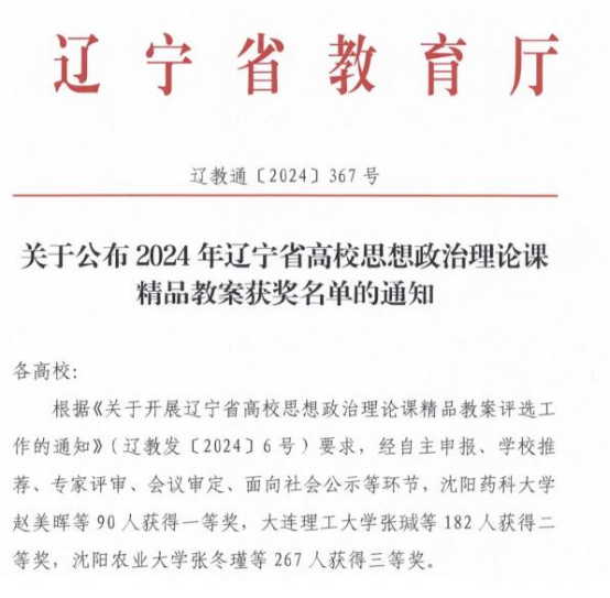本网讯 近日,辽宁省教育厅公布了2024年辽宁省高校思想政治理论课精品教案获奖名单,伟德 教师荣获二等奖1项、三等奖1项。