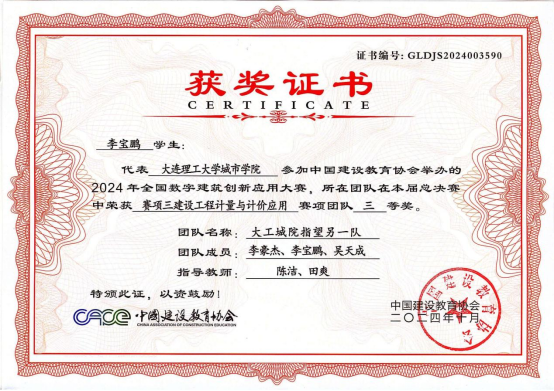 工程造价21级学生李豪杰、李宝鹏、吴天成组成的代表队在该赛事中获得团队三等奖。