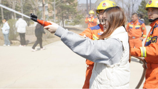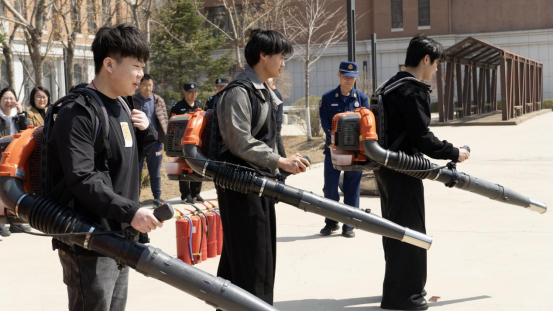 理论培训结束后,森林消防队队长王传颂带领消防战士们在建业楼下为大家展示了各类消防器材的使用方法和操作技巧。师生党员亲身体验了风力灭火机、高压水枪和干粉灭火器等林业消防器材的实际操作过程。