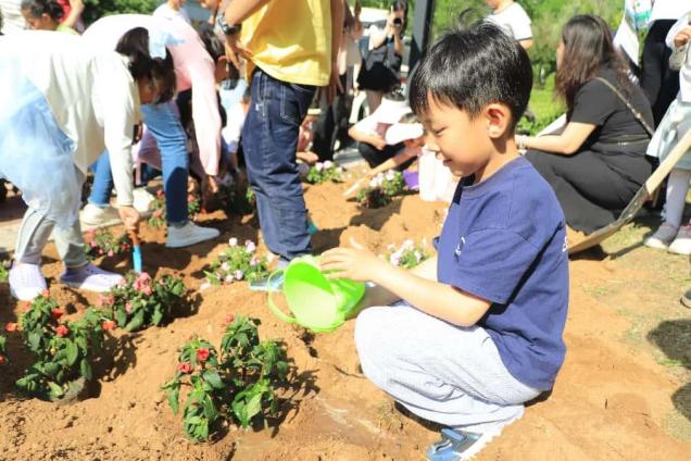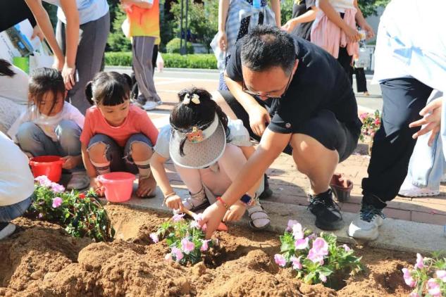 随后,大家在五号公寓楼下开启亲子种植时光。家长孩子携手协作,挖土、栽花、浇水、培土,其乐融融,共同体验劳动快乐,种下希望幼苗。