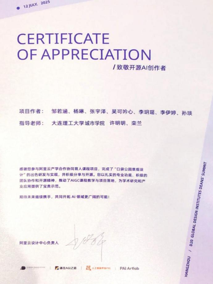 风景园林专业骨干教师许明明、教研室主任栾兰、专业教师姚璐、刘双,2023级风景园林专业学生代表邹若涵、吴可吟心受邀出席“D20全球设计院长峰会”,并在峰会上接受阿里云产学研协同育人优秀AIGC成果颁奖。