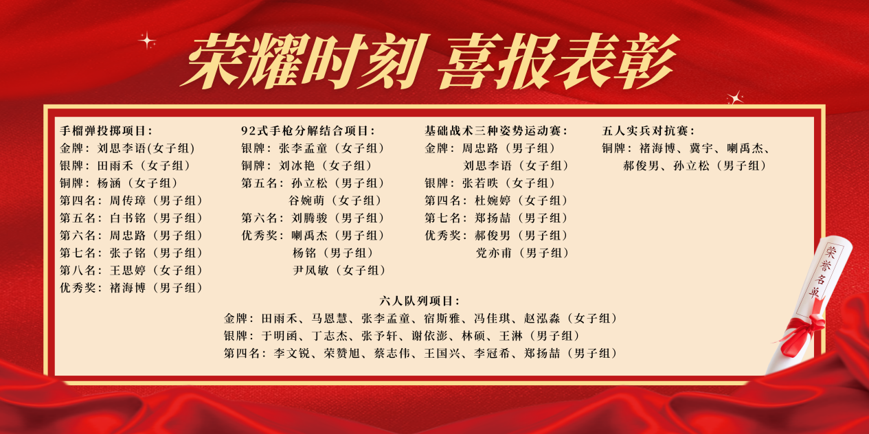 学子最终斩获多项荣誉。其中,男子组基础战术动作、女子组6人队列赛、手榴弹投掷、基础战术动作共夺得9块金牌; 男子组6人队列赛、女子组92手枪分解结合、手榴弹投掷、战术基础动作共夺得9块银牌;男子组5人实兵对抗赛、92手枪分解结合、手榴弹投掷共夺得7块铜牌。