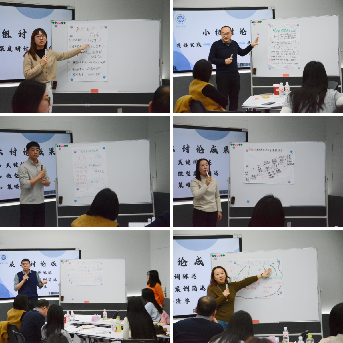 在成果展示环节,各组代表教师手持本组精心绘制的主题海报,采用关键词陈述、微型案例简述、策略清单等方式,将研讨过程中的思考与结论直观呈现。