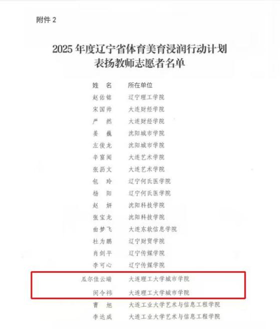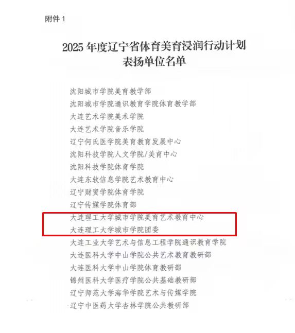 美育艺术教育中心、院团委获评“辽宁省体育美育浸润行动计划表扬单位”;美育艺术教育中心教师瓜尔佳云端、院团委教师闵令祎荣获“表扬教师志愿者”称号。