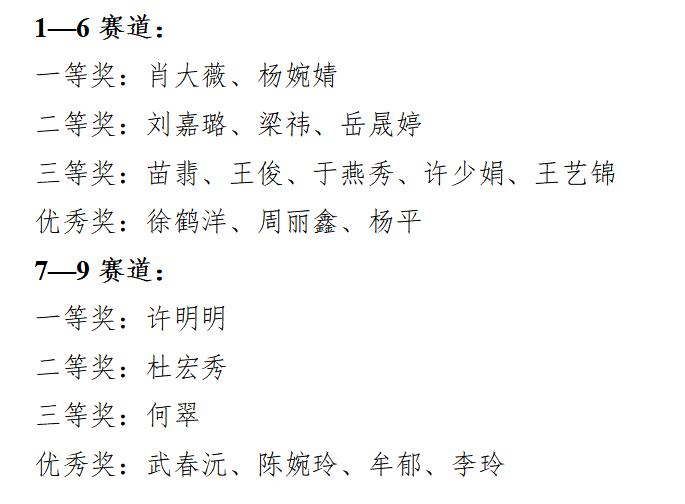 经过激烈的角逐,1—6赛道评选出一等奖2人、二等奖3人、三等奖5人、优秀奖3人;7—9赛道评选出一等奖1人、二等奖1人、三等奖1人、优秀奖4人。