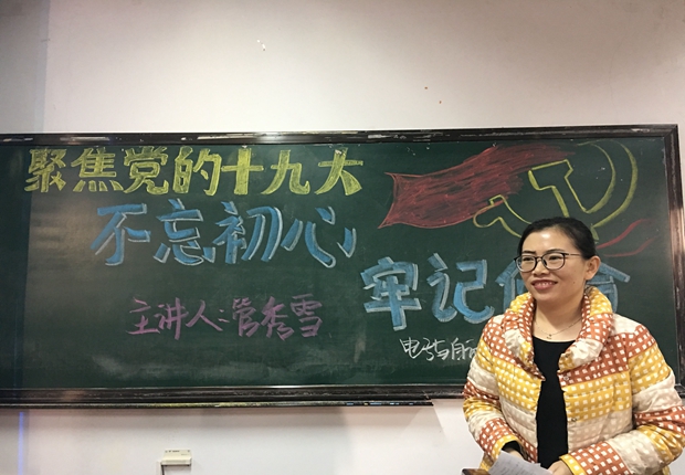 学生党支部在教学楼1209教室举办“聚焦党的十九大——不忘初心、牢记使命”主题讲座,支部全体党员、拟发展对象和入党积极分子聆听了讲座,辅导教师管秀雪主讲。
