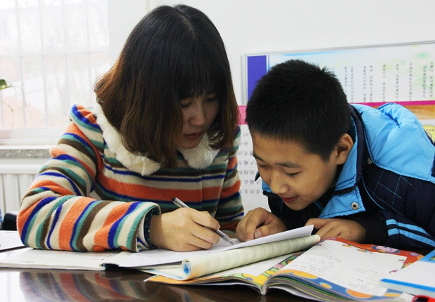 | 志愿者雍萍给孩子辅导课业 |