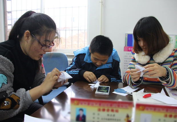 | 志愿者程梦然、雍萍与孩子一起做手工 |