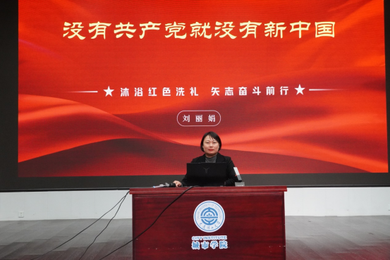 党总支书记刘丽娟老师为学员们讲授《没有共产党就没有新中国》专题党课。刘丽娟老师在课程中讲述了从中国共产党的诞生到如今的百年光辉历程,让同学们深刻理解了今天我们国家的富强来之不易,广大青年更要坚定不移听党话、跟党走,立志做有理想、敢担当、能吃苦、肯奋斗的新时代好青年。