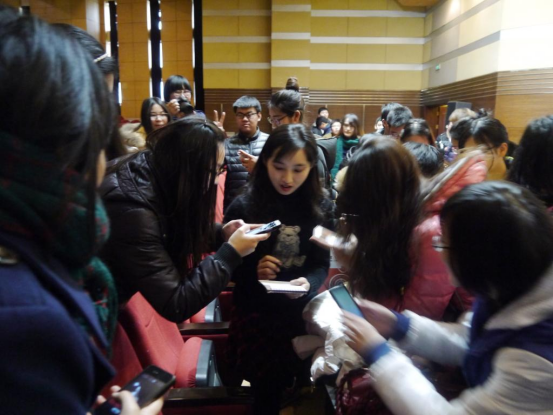 与师生交流。简雅楠在会上的全英文脱稿演讲,再次展现了她的才华与自信,被学弟学妹们誉为“女神”。