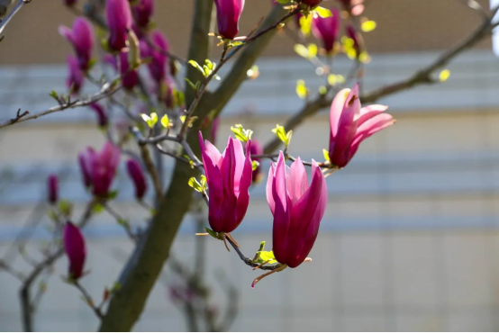 素面粉黛浓,玉盏擎碧空。初开的樱花、桃花、梨花、杏花晶莹剔透地点缀在嫩绿丛中。5号、8号宿舍前,紫玉兰开得热烈、妖娆,绚烂的色彩为静谧的校园平添了一份华贵之气。而旁边的那几丛白玉兰,远远望去,像极了还未消融的冰雪,挂满了枝头,宛如穿着一身白衣的少女,在春风中翩然起舞。
