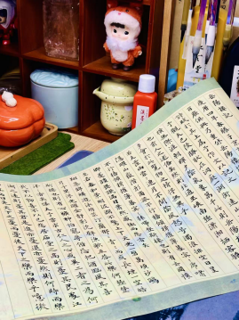 这种智慧延伸至她的人生选择。当旁人追逐流量时,她坚持“交替阅读”中外文学作品;当行业推崇速成时,她重新拾起毛笔。“我正式练习写字是今年3月份,从隶书开始的,现在比较爱写小楷。”她说起书法时眼睛发亮,“喜欢买各种各样好看的书法作品纸,这样会让我写起来心情更好。”这种对创作工具的讲究,体现着她对创作过程的虔诚与热爱。
