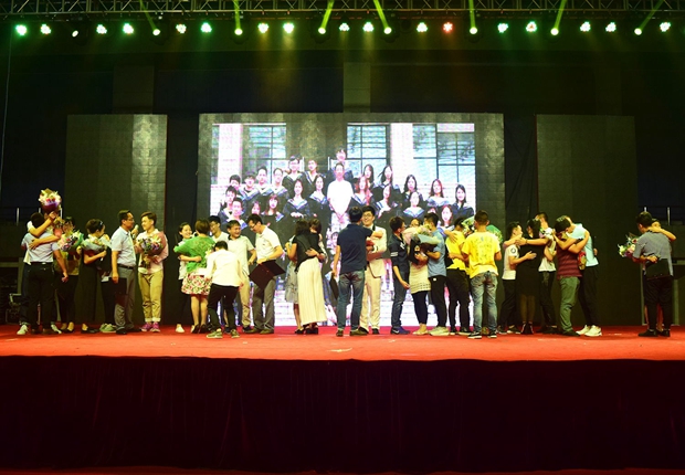 体育馆倾情上演,晚会上表演的十二个节目有合唱、独唱、舞蹈、配音剧、歌伴舞、诗朗诵等节目,这些节目写身边人,唠家常事,讲同窗情,叙师生谊,整台晚会感人至深,催人泪下,令人振奋,赢得了全场观众。