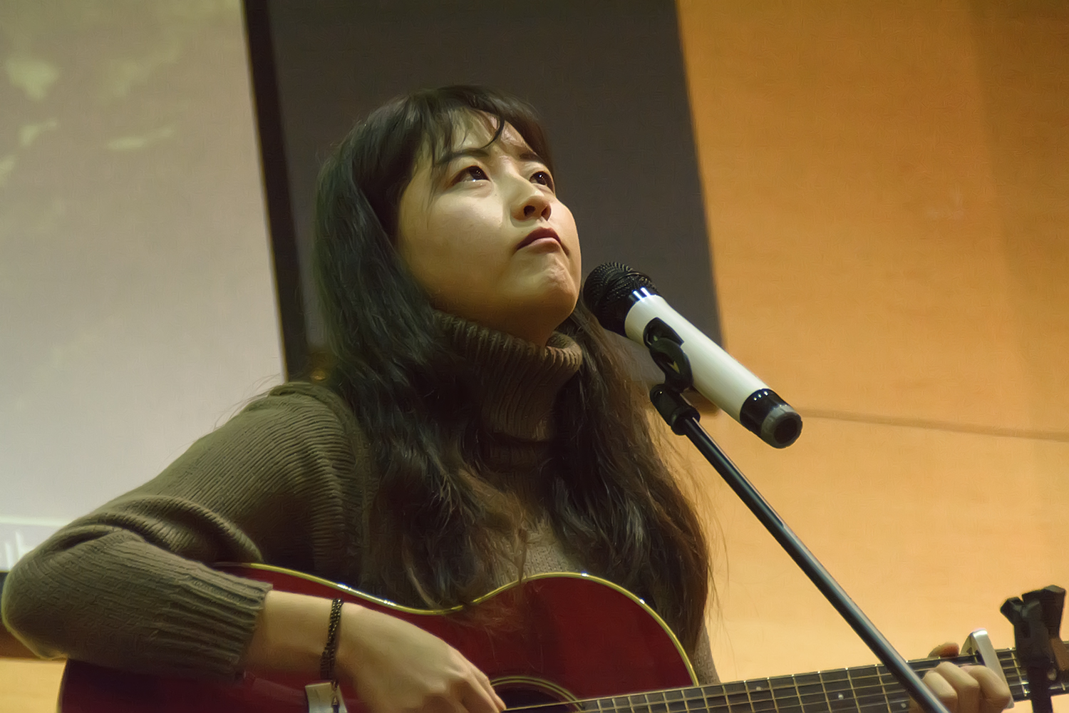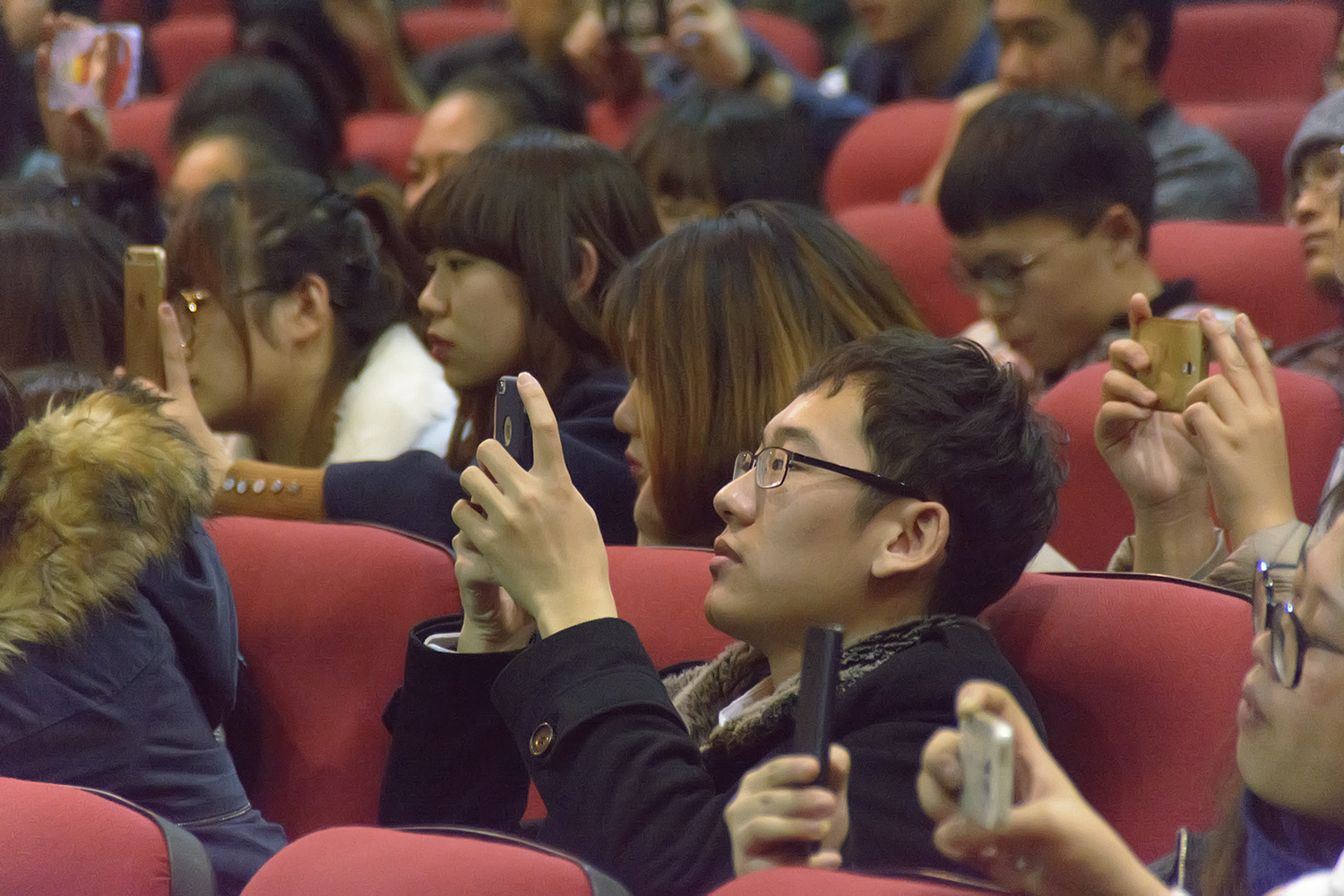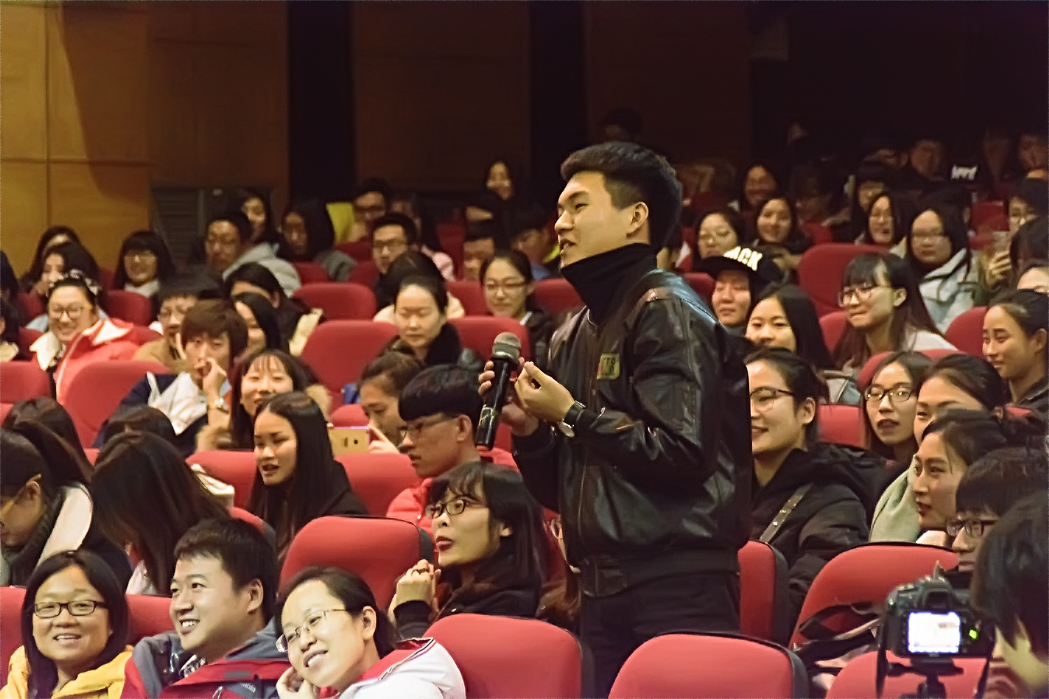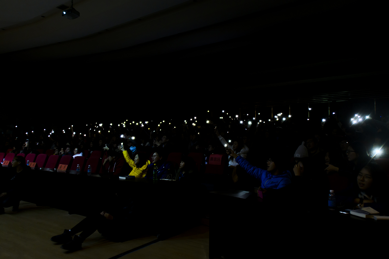 畅聊会进入到民谣演唱环节将气氛推向高潮。歌手张晏铭、王一鸣、大松用现场观众喜闻乐见的民谣讲述心情。现场的照明灯全部关闭,同学们打开手机上的手电筒,黑漆漆的报告厅里,刹那间如萤虫飞舞,如繁星闪烁。那如同来自天际的神秘悠远的乐声,时而浑厚粗犷,时而婉转低回,闭上眼睛仿佛就跟着音乐声去到了另一个安静的世界。最后一首《乌兰巴托的夜》更是让在场的人领略到了游牧民谣的魅力所在,“音乐是羊,我们永远在放牧的路上。”