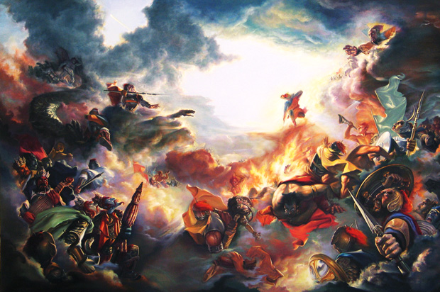 油画作品《战天神》取材于中国古典名著《西游记》中孙悟空大闹天宫的场景。作品气势磅礴,色彩绚丽,并吸取古典绘画中大场景螺旋式构图的技法,突出了画面强烈的动感。画面中孙悟空那若无其事的神情与那些天兵天将惊慌失措举止形成鲜明的对比,凸显出人物的性格特征。画面上方的流星以符号的形式成为整幅画作的灵魂所在,更加体现了孙悟空的精神追求。