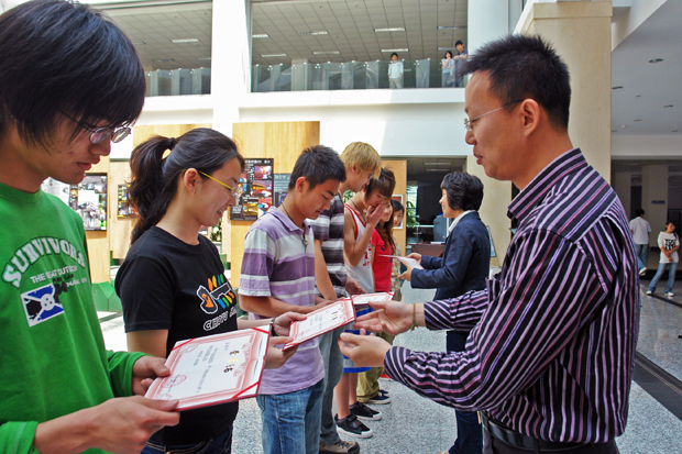 领导为获奖学生颁发了奖品和证书。